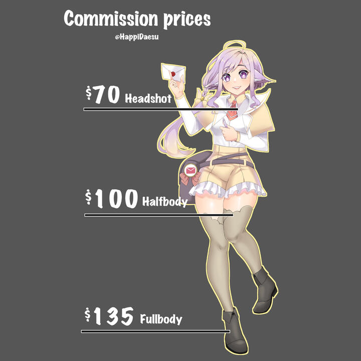 Please DM me at twitter@HappiDaesu to order a commission or inquire about pricing. For NSFW comms you can dm me for samples.